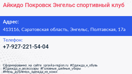 Айкидо Покровск-Энгельс, спортивный клуб по адресу 413116, Саратовская область, Энгельс, Полтавская, 17а в дальнейшем Организация, размещена в следующих категориях: