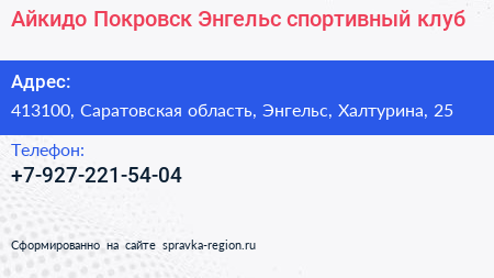 Айкидо Покровск-Энгельс, спортивный клуб по адресу 413100, Саратовская область, Энгельс, Халтурина, 25 в дальнейшем Организация, размещена в следующих категориях: