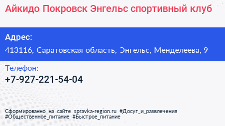 Айкидо Покровск-Энгельс, спортивный клуб по адресу 413116, Саратовская область, Энгельс, Менделеева, 9 в дальнейшем Организация, размещена в следующих категориях: