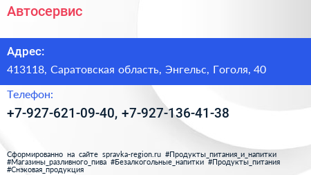 Автосервис по адресу 413118, Саратовская область, Энгельс, Гоголя, 40 в дальнейшем Организация, размещена в следующих категориях: