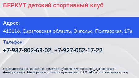 БЕРКУТ, детский спортивный клуб по адресу 413116, Саратовская область, Энгельс, Полтавская, 17а в дальнейшем Организация, размещена в следующих категориях: