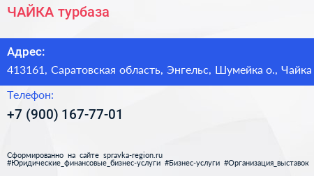 ЧАЙКА, турбаза по адресу 413161, Саратовская область, Энгельс, Шумейка о., Чайка в дальнейшем Организация, размещена в следующих категориях: