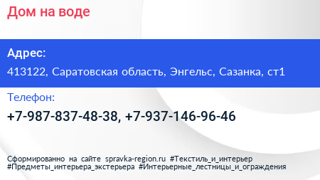 Дом на воде по адресу 413122, Саратовская область, Энгельс, Сазанка, ст1 в дальнейшем Организация, размещена в следующих категориях: