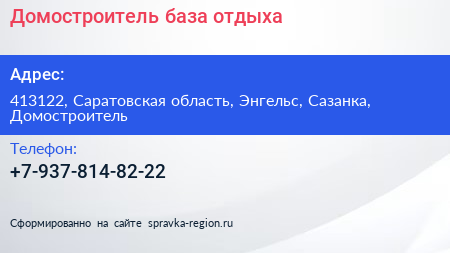 Домостроитель, база отдыха по адресу 413122, Саратовская область, Энгельс, Сазанка, Домостроитель в дальнейшем Организация, размещена в следующих категориях: