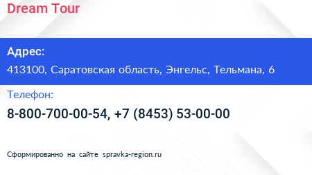 Dream Tour по адресу 413100, Саратовская область, Энгельс, Тельмана, 6 в дальнейшем Организация, размещена в следующих категориях: