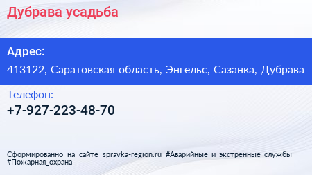 Дубрава, усадьба по адресу 413122, Саратовская область, Энгельс, Сазанка, Дубрава в дальнейшем Организация, размещена в следующих категориях: