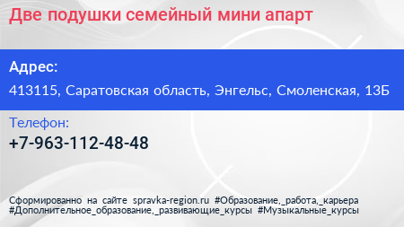 Две подушки, семейный мини-апарт по адресу 413115, Саратовская область, Энгельс, Смоленская, 13Б в дальнейшем Организация, размещена в следующих категориях:
