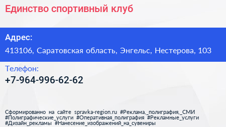 Единство, спортивный клуб по адресу 413106, Саратовская область, Энгельс, Нестерова, 103 в дальнейшем Организация, размещена в следующих категориях: