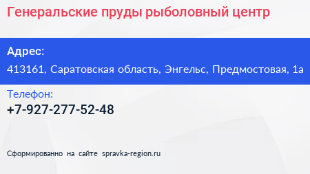 Генеральские пруды, рыболовный центр по адресу 413161, Саратовская область, Энгельс, Предмостовая, 1а в дальнейшем Организация, размещена в следующих категориях: