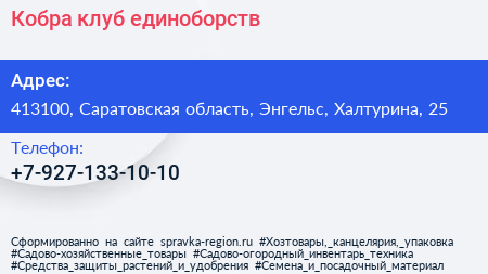 Кобра, клуб единоборств по адресу 413100, Саратовская область, Энгельс, Халтурина, 25 в дальнейшем Организация, размещена в следующих категориях: