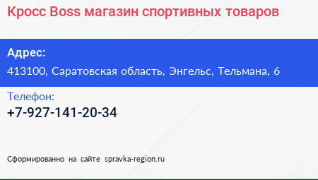Кросс Boss, магазин спортивных товаров по адресу 413100, Саратовская область, Энгельс, Тельмана, 6 в дальнейшем Организация, размещена в следующих категориях: