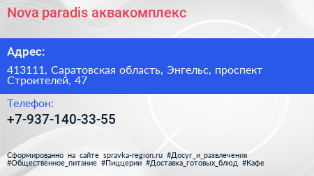 Nova paradis, аквакомплекс по адресу 413111, Саратовская область, Энгельс, проспект Строителей, 47 в дальнейшем Организация, размещена в следующих категориях: