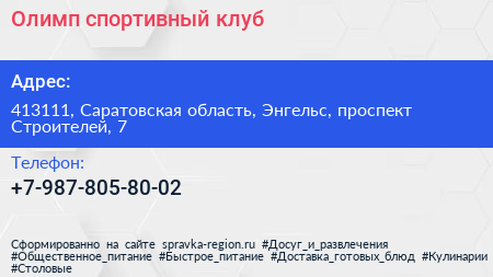 Олимп, спортивный клуб по адресу 413111, Саратовская область, Энгельс, проспект Строителей, 7 в дальнейшем Организация, размещена в следующих категориях: