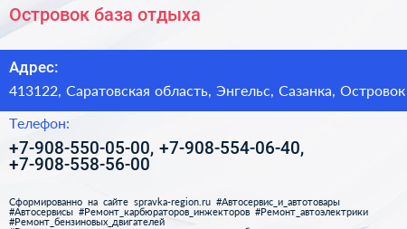Островок, база отдыха по адресу 413122, Саратовская область, Энгельс, Сазанка, Островок в дальнейшем Организация, размещена в следующих категориях: