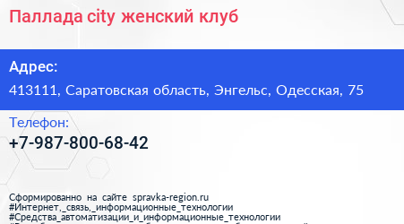 Паллада city, женский клуб по адресу 413111, Саратовская область, Энгельс, Одесская, 75 в дальнейшем Организация, размещена в следующих категориях: