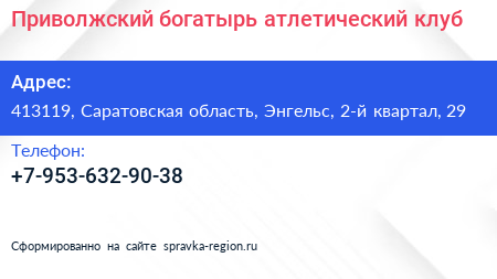 Приволжский богатырь, атлетический клуб по адресу 413119, Саратовская область, Энгельс, 2-й квартал, 29 в дальнейшем Организация, размещена в следующих категориях: