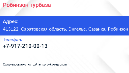 Робинзон, турбаза по адресу 413122, Саратовская область, Энгельс, Сазанка, Робинзон в дальнейшем Организация, размещена в следующих категориях: