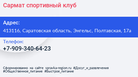 Сармат, спортивный клуб по адресу 413116, Саратовская область, Энгельс, Полтавская, 17а в дальнейшем Организация, размещена в следующих категориях: