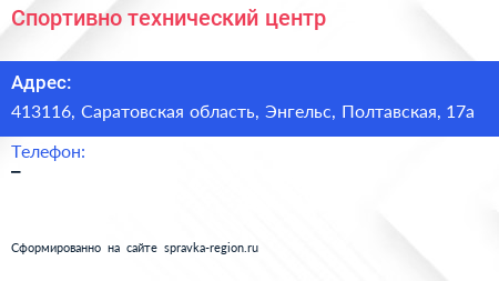 Спортивно-технический центр по адресу 413116, Саратовская область, Энгельс, Полтавская, 17а в дальнейшем Организация, размещена в следующих категориях: