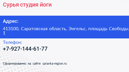 Сурья, студия йоги по адресу 413100, Саратовская область, Энгельс, площадь Свободы, 1 в дальнейшем Организация, размещена в следующих категориях: