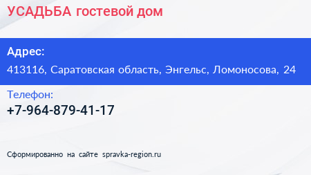 УСАДЬБА, гостевой дом по адресу 413116, Саратовская область, Энгельс, Ломоносова, 24 в дальнейшем Организация, размещена в следующих категориях: