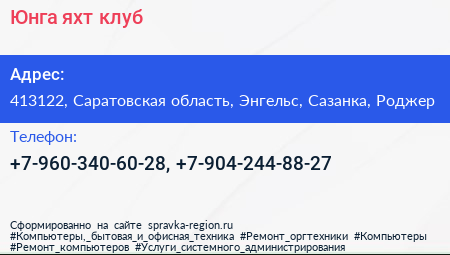 Юнга, яхт-клуб по адресу 413122, Саратовская область, Энгельс, Сазанка, Роджер в дальнейшем Организация, размещена в следующих категориях: