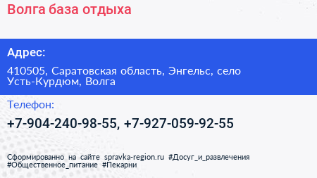 Волга, база отдыха по адресу 410505, Саратовская область, Энгельс, село Усть-Курдюм, Волга в дальнейшем Организация, размещена в следующих категориях: