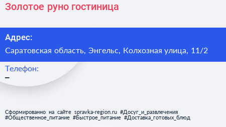 Золотое руно, гостиница по адресу Саратовская область, Энгельс, Колхозная улица, 11/2 в дальнейшем Организация, размещена в следующих категориях: