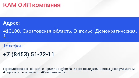 КАМ-ОЙЛ, компания по адресу 413100, Саратовская область, Энгельс, Демократическая, 1 в дальнейшем Организация, размещена в следующих категориях: