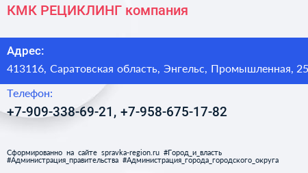 КМК-РЕЦИКЛИНГ, компания по адресу 413116, Саратовская область, Энгельс, Промышленная, 25 в дальнейшем Организация, размещена в следующих категориях: