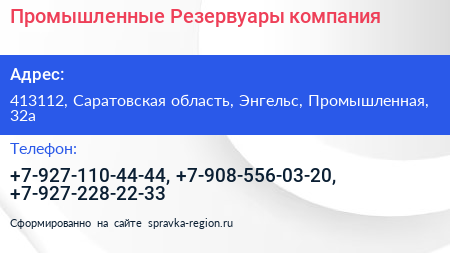 Промышленные Резервуары, компания по адресу 413112, Саратовская область, Энгельс, Промышленная, 32а в дальнейшем Организация, размещена в следующих категориях: