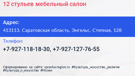 12 стульев, мебельный салон по адресу 413113, Саратовская область, Энгельс, Степная, 128 в дальнейшем Организация, размещена в следующих категориях: