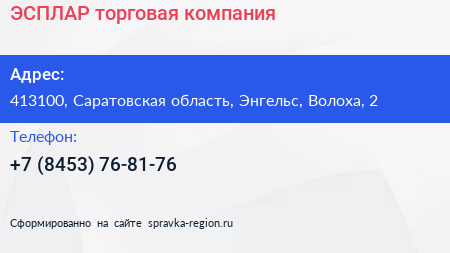 ЭСПЛАР, торговая компания по адресу 413100, Саратовская область, Энгельс, Волоха, 2 в дальнейшем Организация, размещена в следующих категориях: