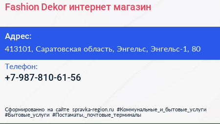 Fashion Dekor, интернет-магазин по адресу 413101, Саратовская область, Энгельс, Энгельс-1, 80 в дальнейшем Организация, размещена в следующих категориях: