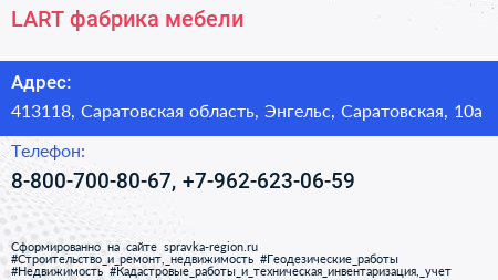 LART, фабрика мебели по адресу 413118, Саратовская область, Энгельс, Саратовская, 10а в дальнейшем Организация, размещена в следующих категориях: