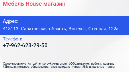 Мебель House, магазин по адресу 413113, Саратовская область, Энгельс, Степная, 122а в дальнейшем Организация, размещена в следующих категориях: