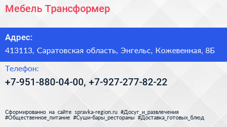 Мебель Трансформер по адресу 413113, Саратовская область, Энгельс, Кожевенная, 8Б в дальнейшем Организация, размещена в следующих категориях: