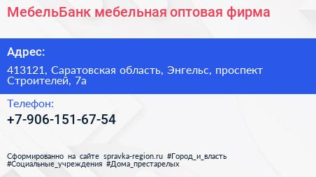 МебельБанк, мебельная оптовая фирма по адресу 413121, Саратовская область, Энгельс, проспект Строителей, 7а в дальнейшем Организация, размещена в следующих категориях: