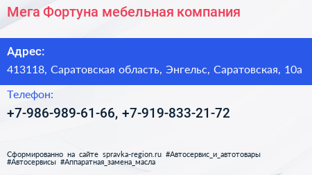 Мега Фортуна, мебельная компания по адресу 413118, Саратовская область, Энгельс, Саратовская, 10а в дальнейшем Организация, размещена в следующих категориях: