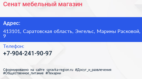 Сенат, мебельный магазин по адресу 413101, Саратовская область, Энгельс, Марины Расковой, 9 в дальнейшем Организация, размещена в следующих категориях: