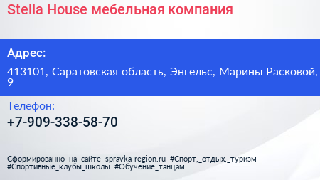 Stella House, мебельная компания по адресу 413101, Саратовская область, Энгельс, Марины Расковой, 9 в дальнейшем Организация, размещена в следующих категориях: