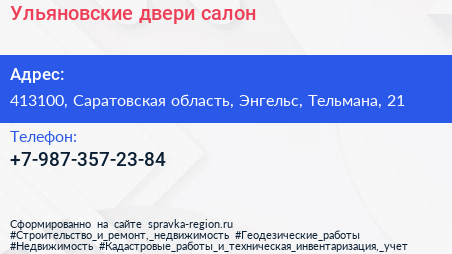Ульяновские двери, салон по адресу 413100, Саратовская область, Энгельс, Тельмана, 21 в дальнейшем Организация, размещена в следующих категориях: