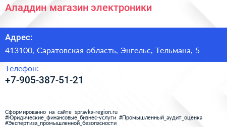 Аладдин, магазин электроники по адресу 413100, Саратовская область, Энгельс, Тельмана, 5 в дальнейшем Организация, размещена в следующих категориях: