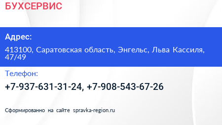 БУХСЕРВИС по адресу 413100, Саратовская область, Энгельс, Льва Кассиля, 47/49 в дальнейшем Организация, размещена в следующих категориях:
