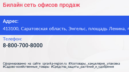 Билайн, сеть офисов продаж по адресу 413100, Саратовская область, Энгельс, площадь Ленина, 4 в дальнейшем Организация, размещена в следующих категориях: