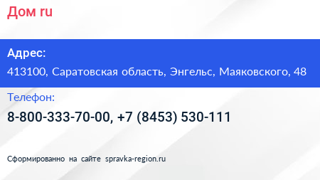 Дом.ru по адресу 413100, Саратовская область, Энгельс, Маяковского, 48 в дальнейшем Организация, размещена в следующих категориях: