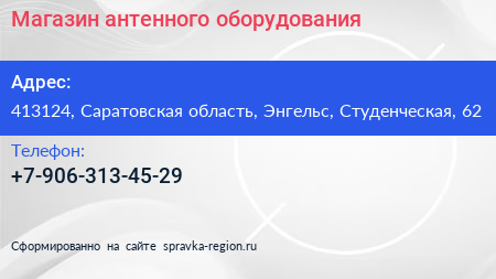 Магазин антенного оборудования по адресу 413124, Саратовская область, Энгельс, Студенческая, 62 в дальнейшем Организация, размещена в следующих категориях: