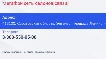 МегаФон, сеть салонов связи по адресу 413100, Саратовская область, Энгельс, площадь Ленина, 4 в дальнейшем Организация, размещена в следующих категориях: