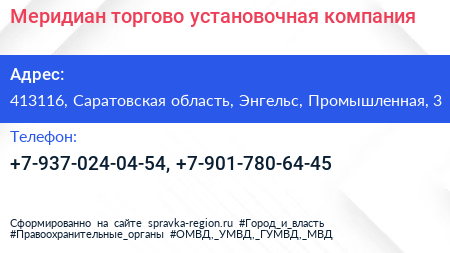 Меридиан, торгово-установочная компания по адресу 413116, Саратовская область, Энгельс, Промышленная, 3 в дальнейшем Организация, размещена в следующих категориях: