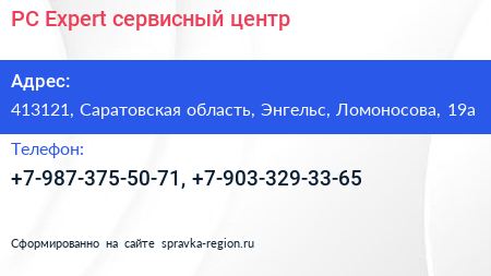 PC-Expert, сервисный центр по адресу 413121, Саратовская область, Энгельс, Ломоносова, 19а в дальнейшем Организация, размещена в следующих категориях: